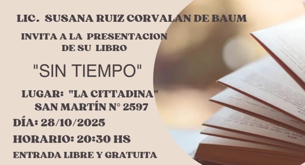 La escritora y artista tucumana Susana Ruiz Corvalán de Baum presentará su nuevo libro titulado Sin tiempo el martes 28 de octubre a las 20:30, en La Cittadina, un espacio cultural independiente ubicado en San Martín 2597, en la ciudad de Concepción. La entrada será libre y gratuita, abierta a todo público.